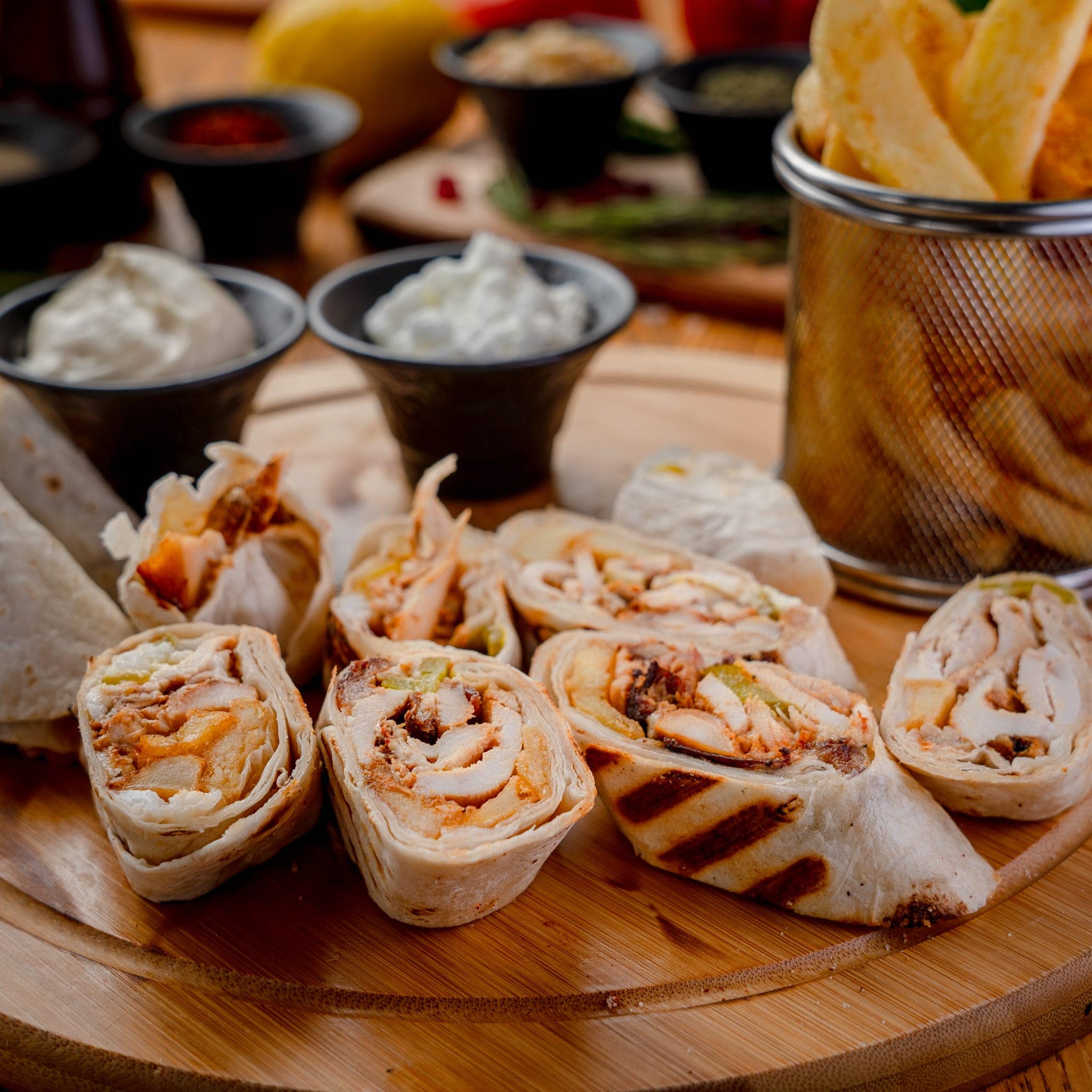 Shaorma de pui la jar asortata cu sos de usturoi, castraveti murati si lipie saj