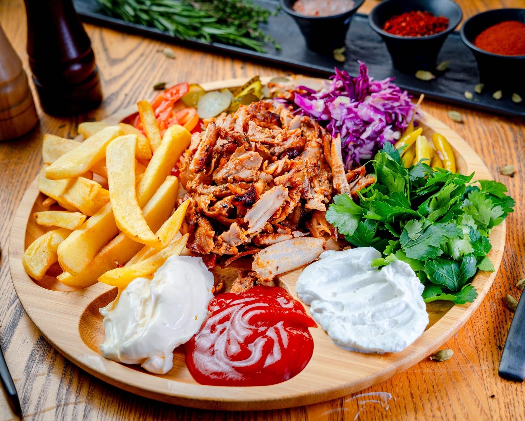 Otet, Lămâie, Sare), Toum - 24.15g (Apă, Usturoi, Ou, Ulei de floarea soarelui, Lămâie, Sare), Muraturi, Varza mix, Ardei iute, Ceapă,